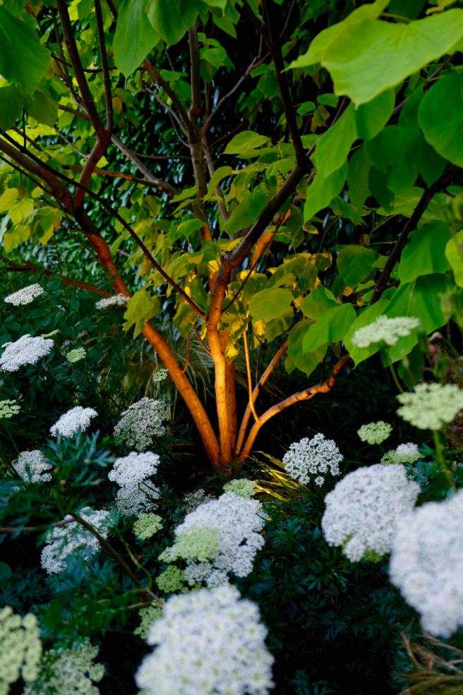 Spheres throughout the garden represent planets and Corten rings act as orbiting features. The hard landscaping materials were specifically chosen to represent light and dark. The paving is cut up in lines of orbit, linking one area to the next. The main axis pathway through the garden is interrupted by planting, forcing you to take more time to notice and appreciate the planting. At night the garden comes alive bringing many moons into the garden.